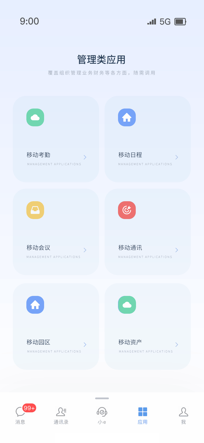 提供丰富的管理类移动应用,如移动考勤、移动日程、移动会议、移动沟通等,覆盖组织管理业务财务等各方面。
